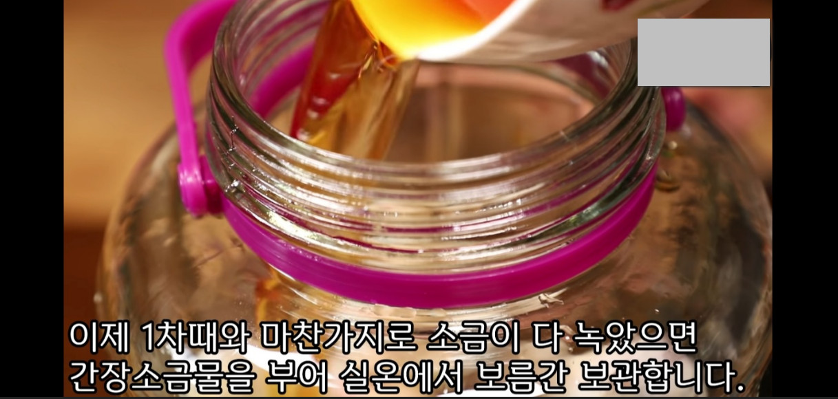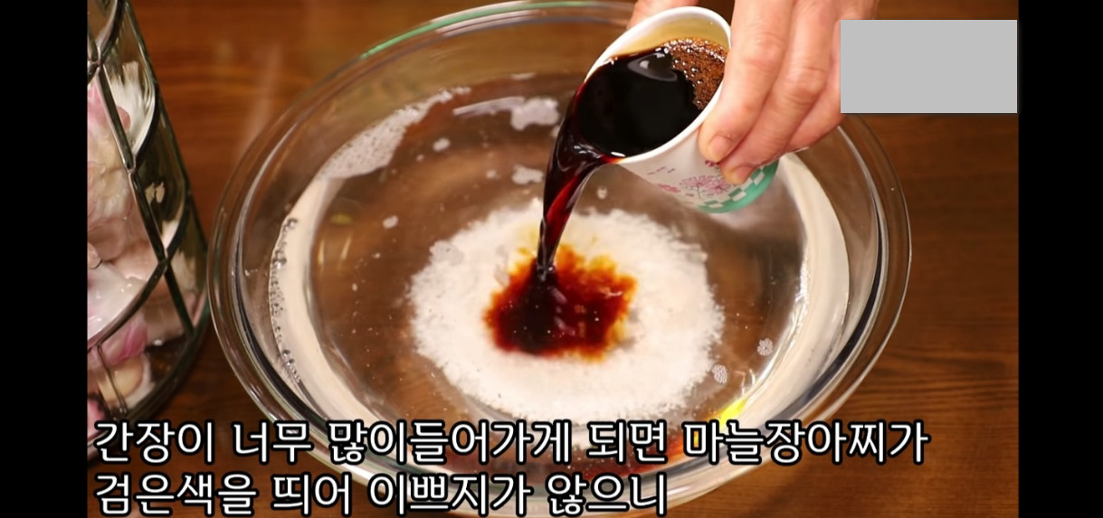 소금이 완전히 녹으면, 1차로 절여둔 마늘장아찌에 이 액체를 부어주세요.