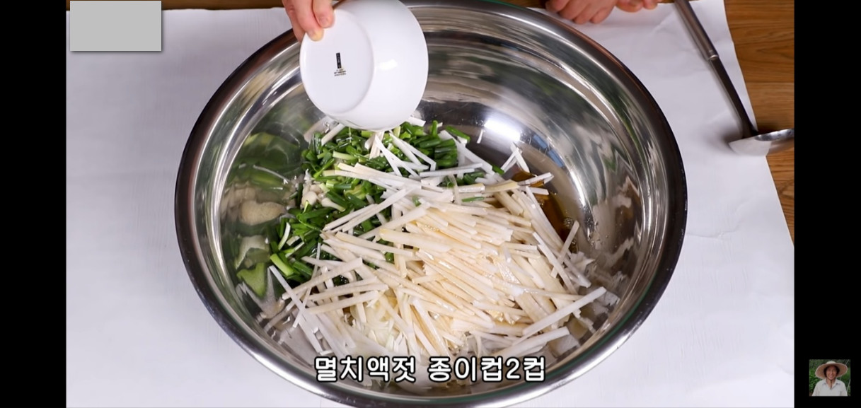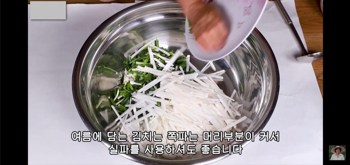 양동이에 적당한 크기로 자른 쪽파 3줌과 채 썬 무 700g을 담아주세요.