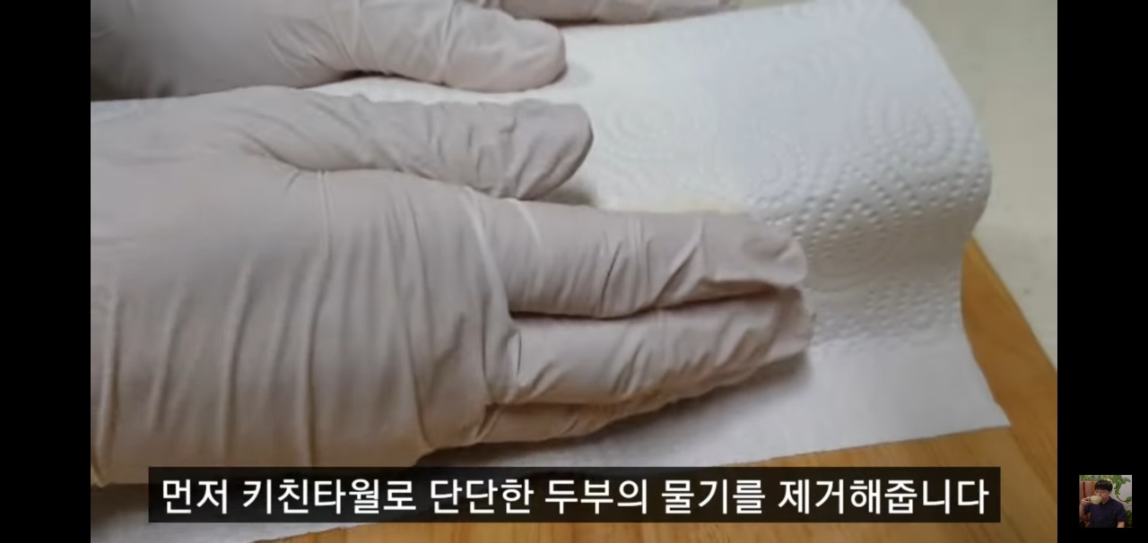 두부조림 황금레시피의 첫 번째 단계는 두부 손질이에요. 포장을 열고 두부를 키친타올로 감싸서 물기를 제거한 후, 먹기 좋은 크기로 썰어주세요.