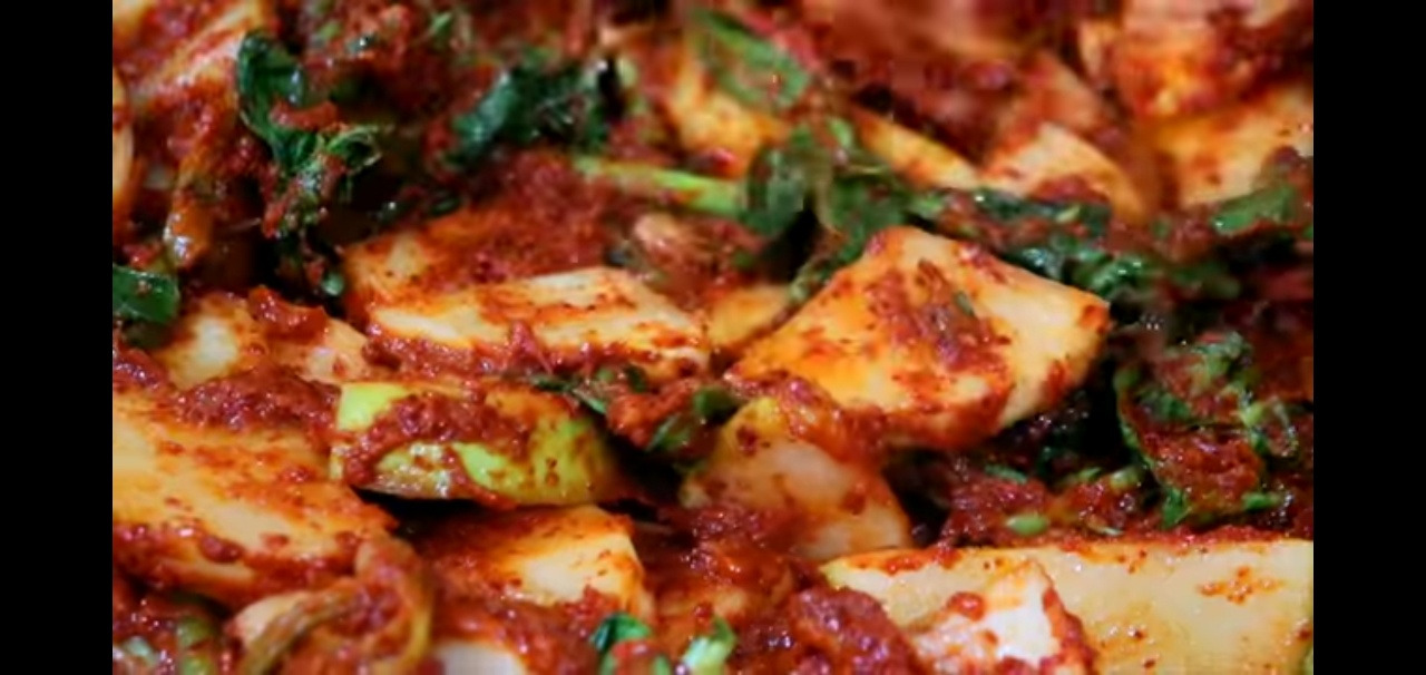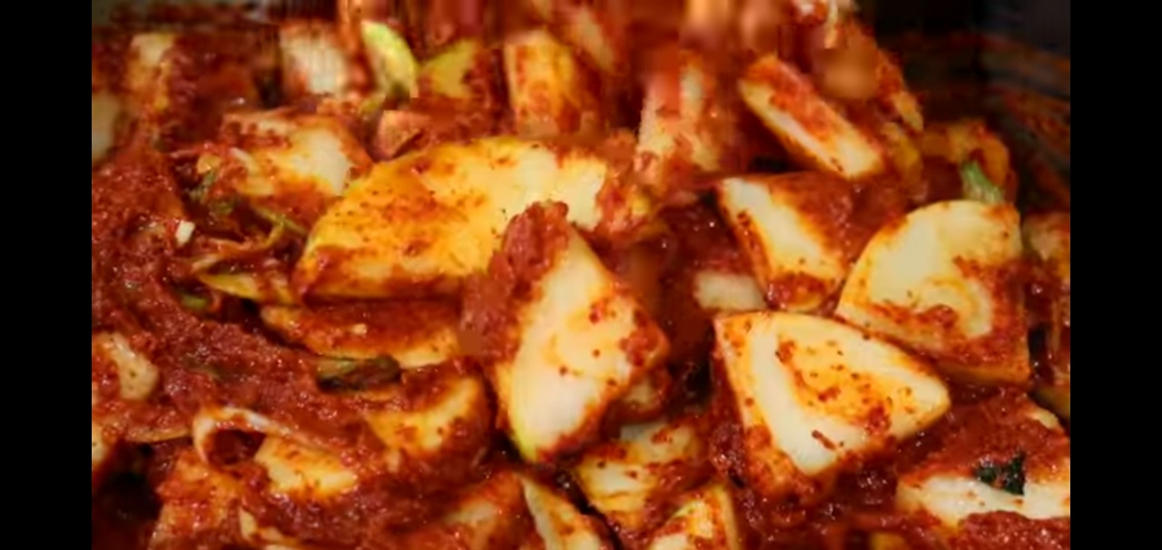 잘 섞어주면 양념이 고루 잘 묻고, 보기에도 맛있어 보이는 석박이 김치가 완성돼요.