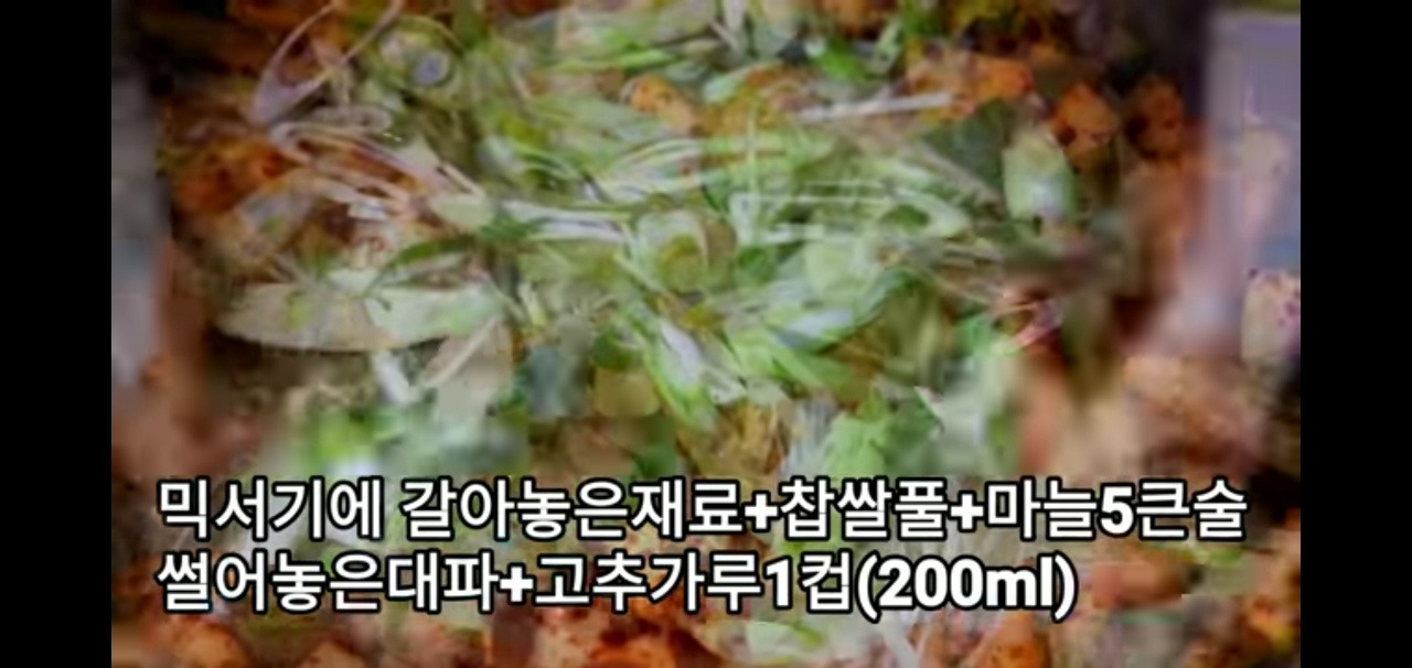 이제 쑤어둔 찹쌀풀과 다진 마늘 5스푼, 대파, 고춧가루 한 컵을 추가로 넣어주세요.