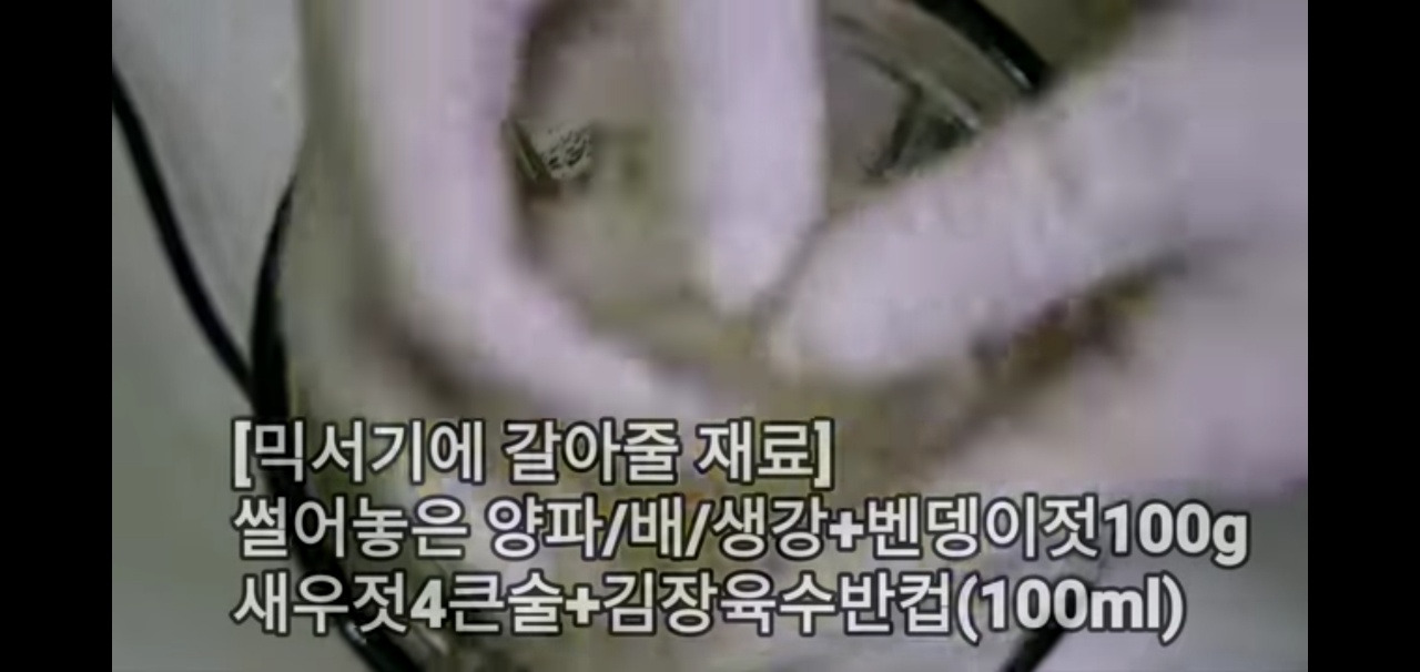 썰어둔 양파, 배, 생강에 벤댕이젓 100g, 새우젓 4스푼, 김장 육수 반 컵을 넣고 믹서로 곱게 갈아주세요.