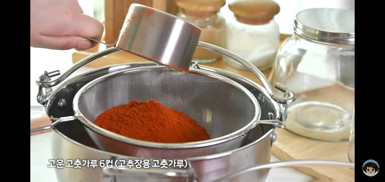 고추장용 고운 고추가루 6컵을 메줏가루처럼 체에 걸러서 고루 풀어 넣어주세요.