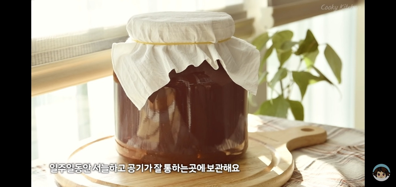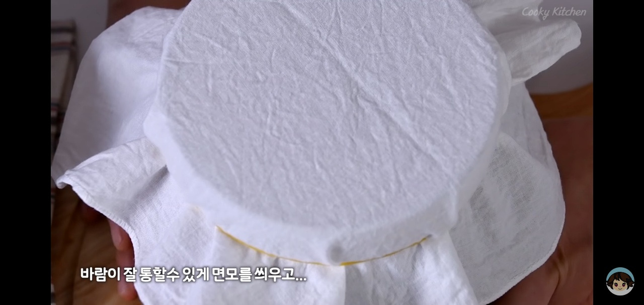 바람이 잘 통하게 면포를 덮고 고무줄로 고정시켜서 맛있게 숙성될 수 있도록 해주세요.
