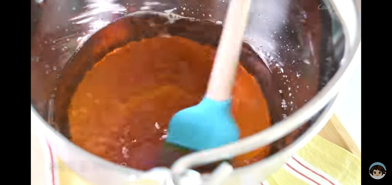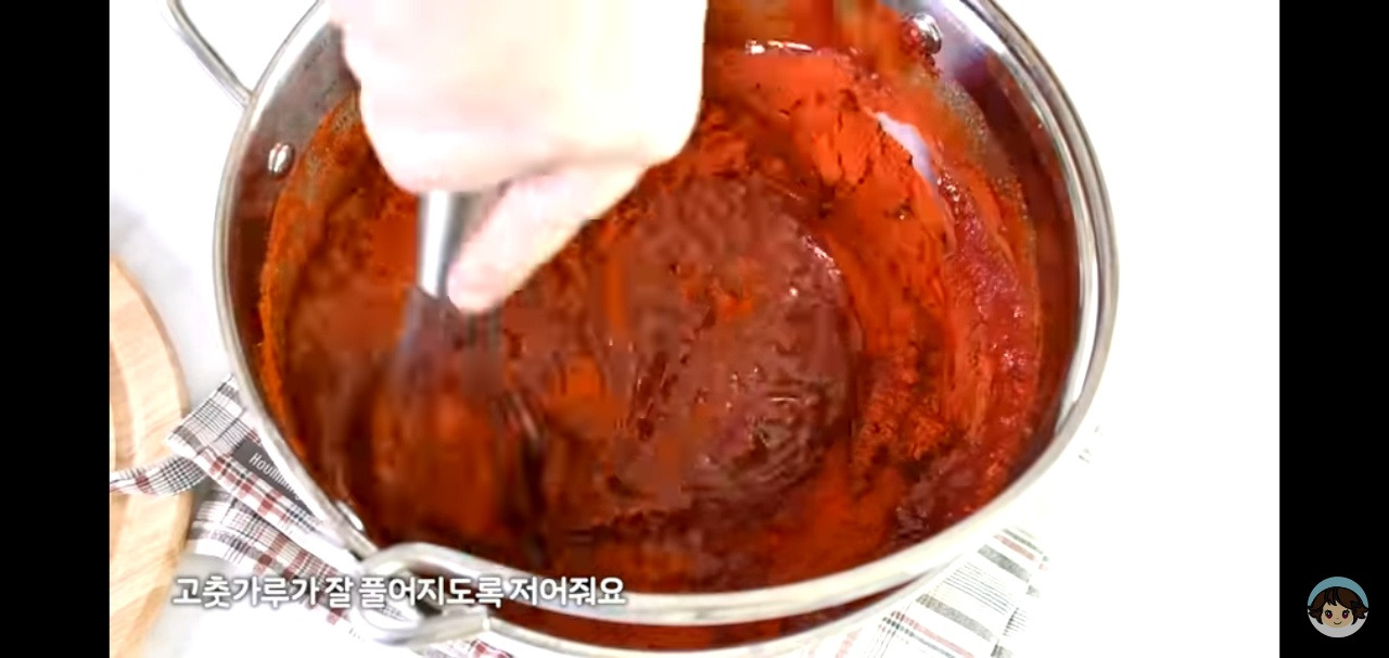 고추가루가 잘 섞이도록 골고루 저어주면 고추장처럼 보이기 시작해요!
