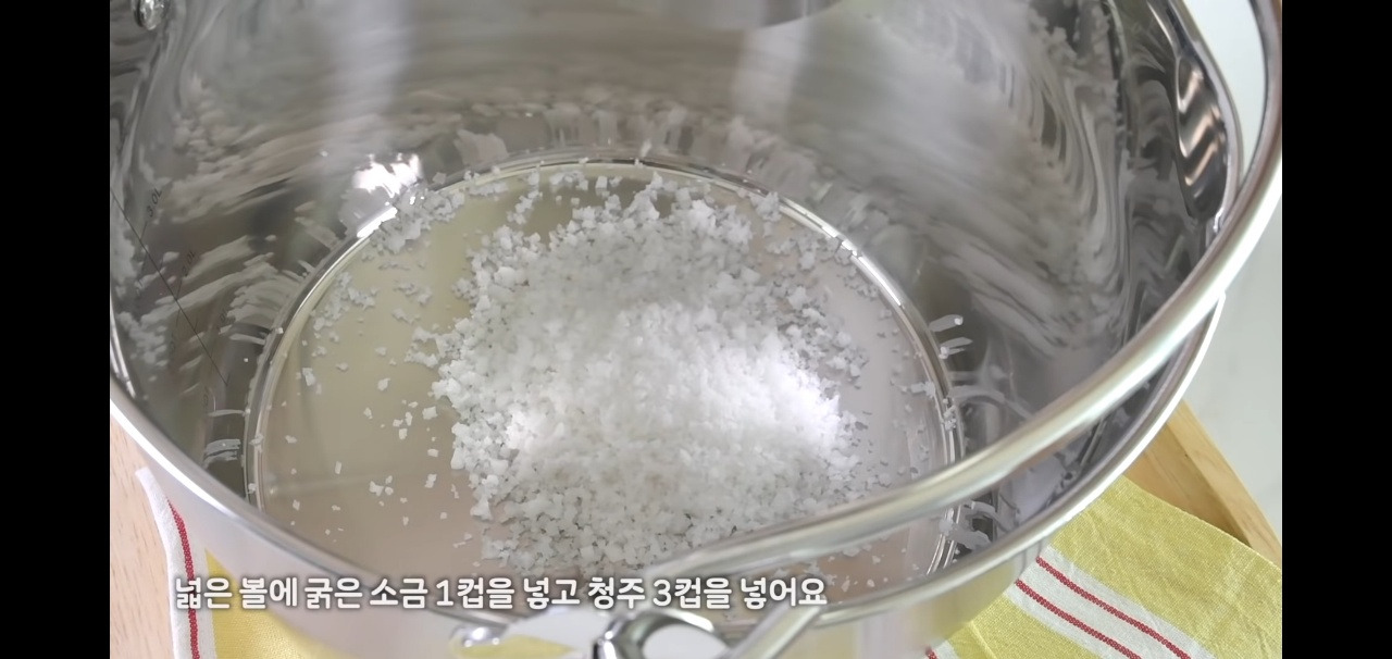 큰 볼에 굵은 소금 한 컵과 청주 3컵을 넣어주세요.