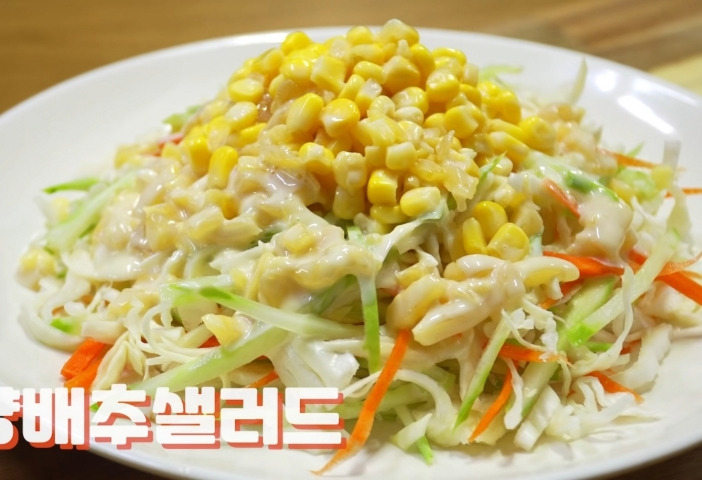 나머지 드레싱은 스위트콘과 함께 섞어서 위에 올리면, 식감이 더 살아나고 맛있는 양배추 샐러드가 완성돼요.