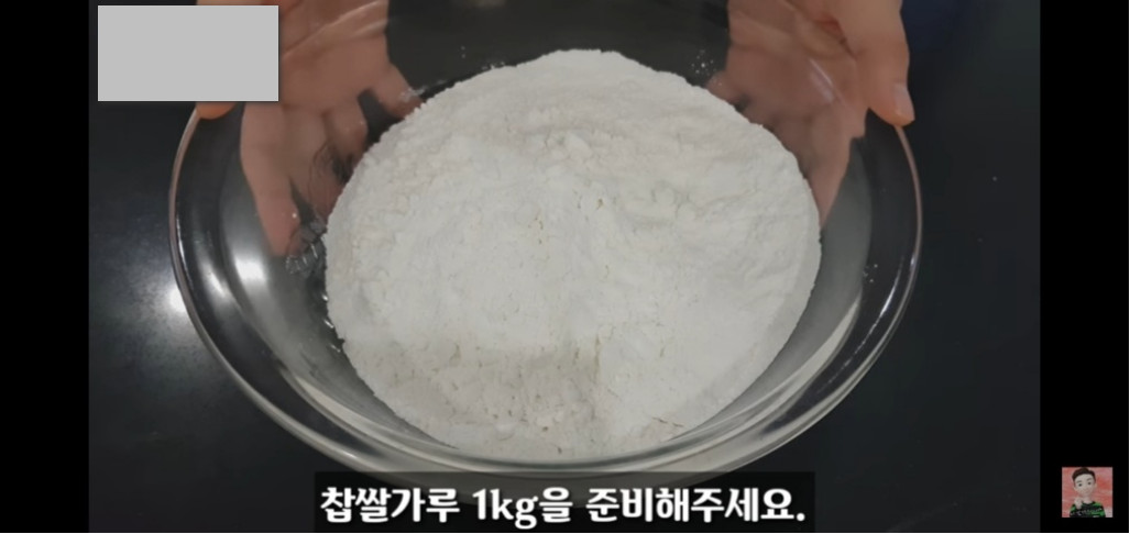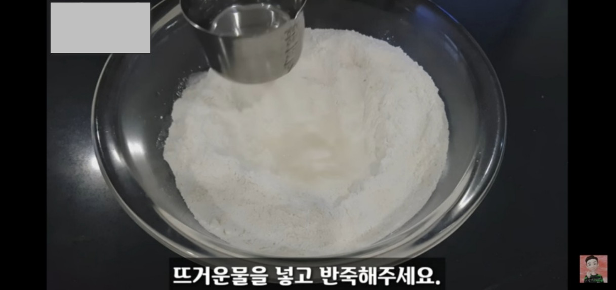 찹쌀가루 1kg에 소금 반 스푼과 뜨거운 물 1컵을 넣고 잘 반죽해주세요.