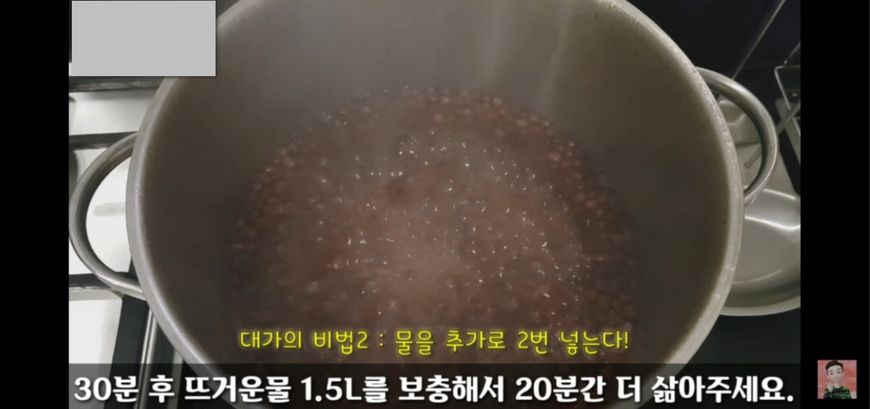 30분 동안 끓인 팥에 뜨거운 물 1.5L를 추가한 후, 20분 더 끓여주세요.