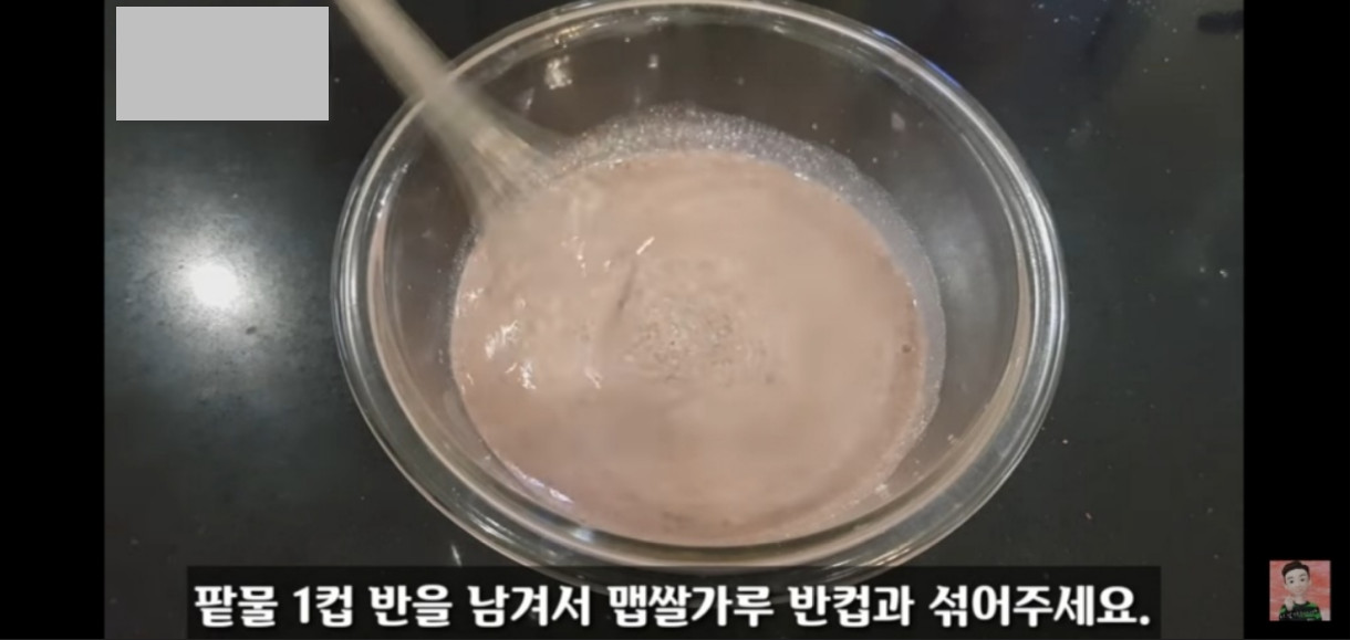 팥물 1.5컵을 따로 빼둔 후, 맵쌀가루 반 컵과 섞어주세요. 이 혼합물은 나중에 팥죽 농도를 조절할 때 사용됩니다.