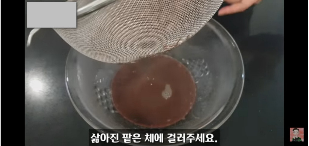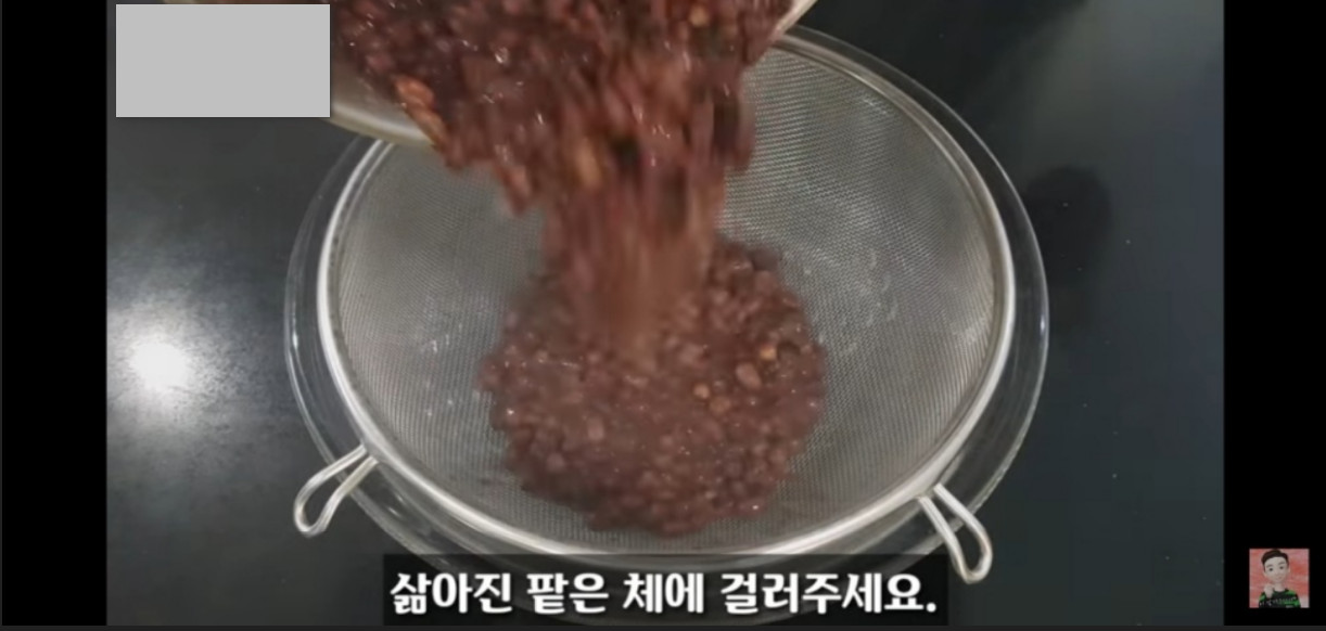 삶아진 팥은 체에 걸러서 팥물과 팥을 분리해 주세요. 팥물은 나중에 팥죽 재료로 사용되니까 버리지 말고 잘 보관해두세요!