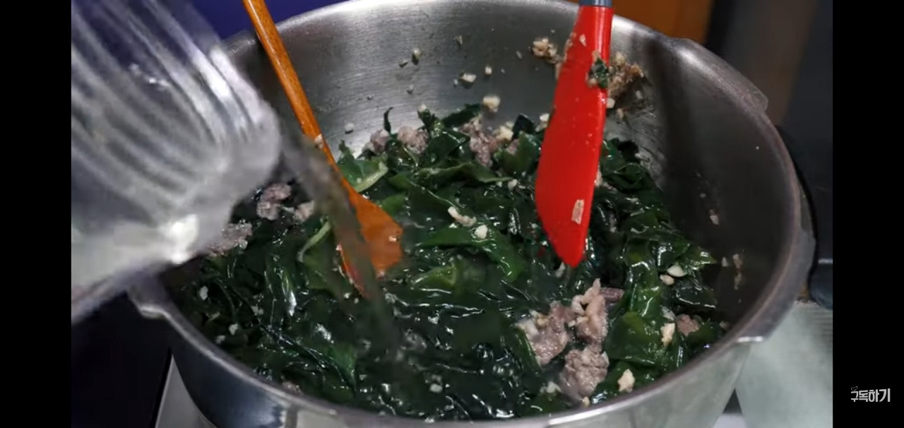 그리고 생수를 조금 넣고 졸이듯이 볶아주면 미역에 고기와 재료들의 맛이 잘 배어, 훨씬 더 맛있는 소고기 미역국이 완성돼요!