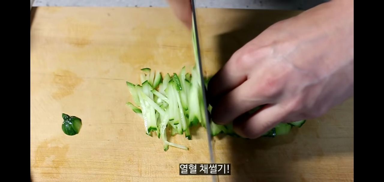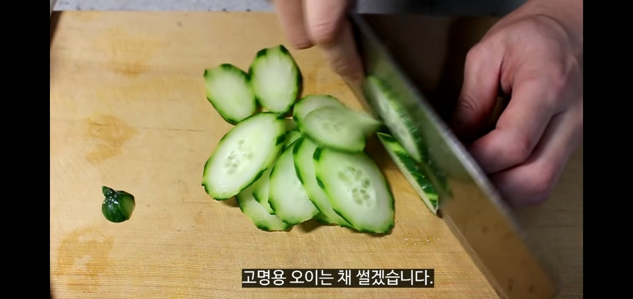 먼저 고명으로 사용할 오이 1/4개를 깨끗이 씻은 후, 채 썰어주세요.