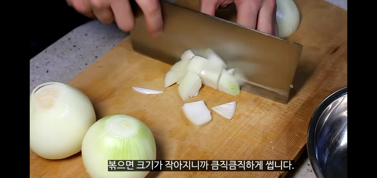 양파 3개는 적당한 크기로 썰어주세요, 사진처럼요. 짜장에 양파가 많이 들어가면 식감이 더 살아나고, 달콤한 맛도 한층 더 풍부해져요!