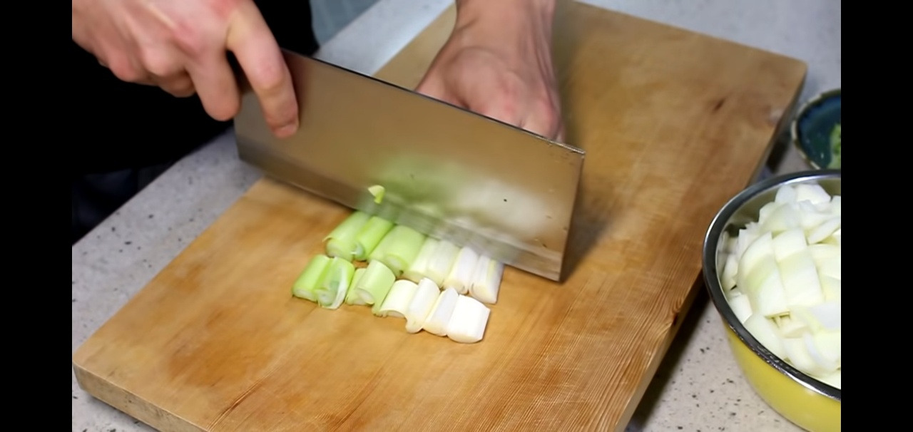 대파는 반으로 자른 후, 사진처럼 양파와 비슷한 크기로 썰어주세요.
