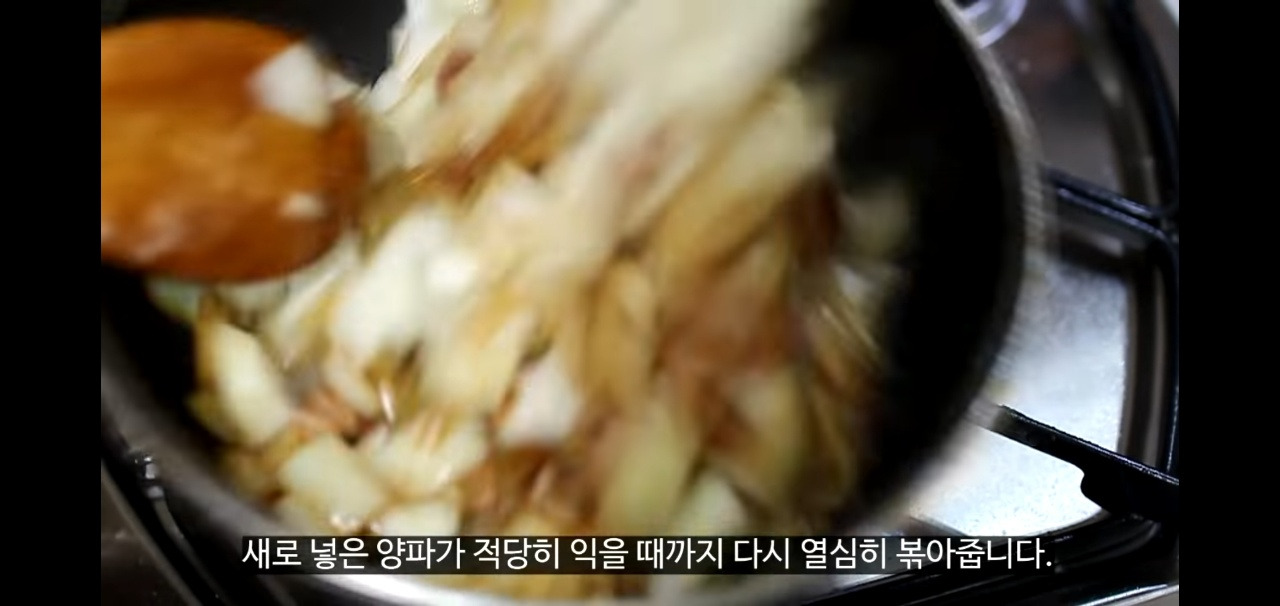 재료를 모두 넣은 후에는 남은 양파를 전부 넣고, 양파가 다 익을 때까지 잘 볶아주세요!