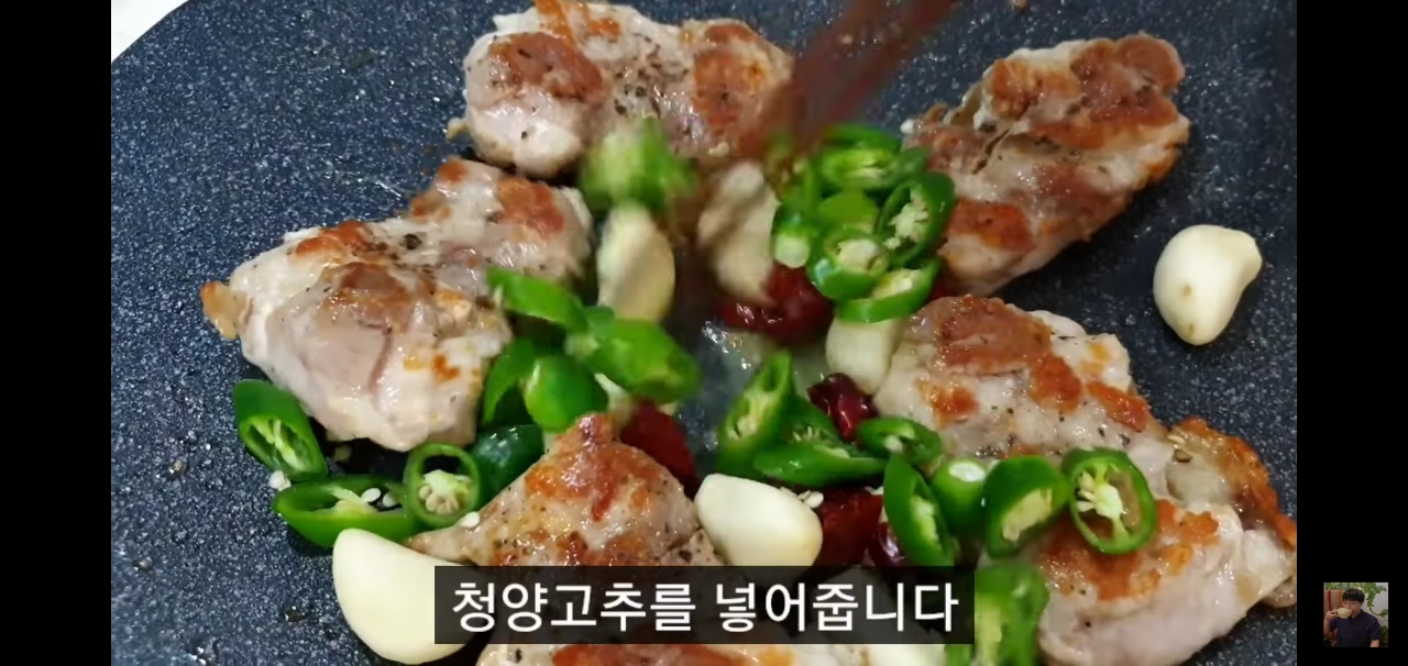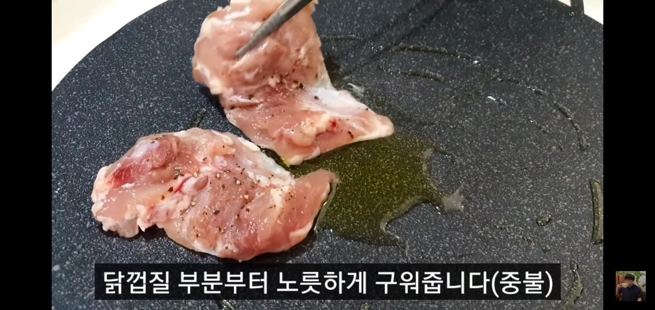 중불로 팬을 달군 뒤, 닭껍질 부분부터 노릇하게 구워주세요.