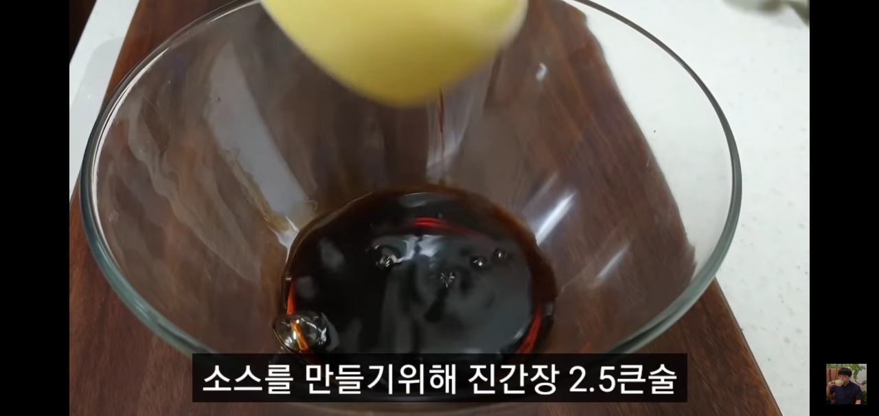 이제 닭다리살 스테이크를 위한 양념장을 만들어볼게요. 그릇에 진간장 2.5스푼을 넣어주세요.