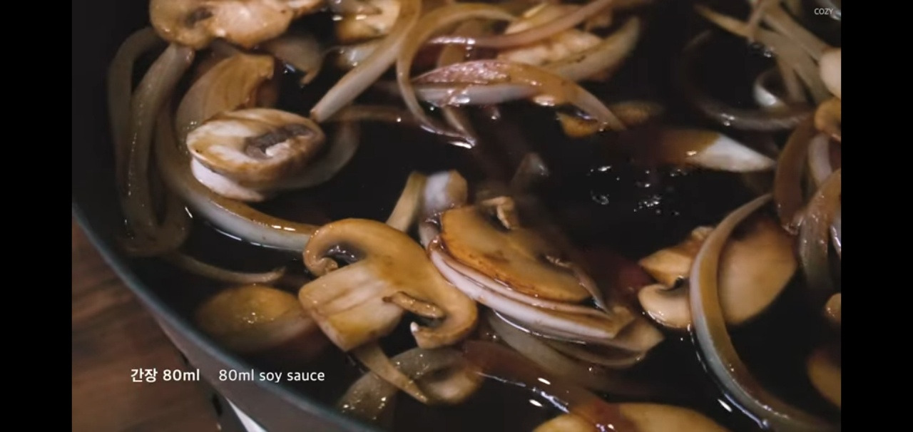 양파와 버섯이 어느 정도 익으면, 간장 80ml와 케첩 6~7스푼을 넣어주세요.