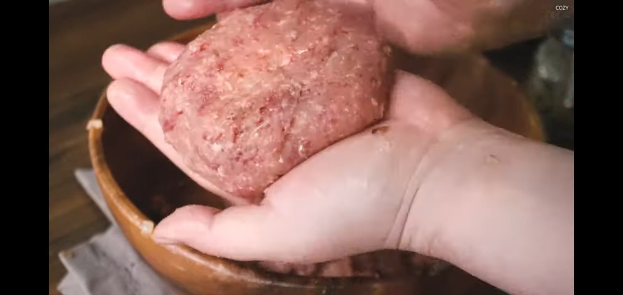 그다음, 중간 부분을 살짝 눌러서 오목하게 만들어 주세요. 함박스테이크를 구울 때 가운데가 부풀어 오르지 않도록 이렇게 눌러줘야 나중에 평평하고 맛있게 완성됩니다.