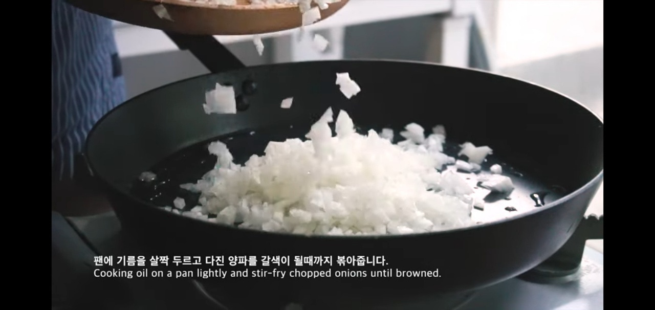 이제 썰어둔 양파를 볶아볼까요? 팬에 기름을 두르고 다진 양파를 넣어, 갈색으로 변할 때까지 잘 볶아주세요.
