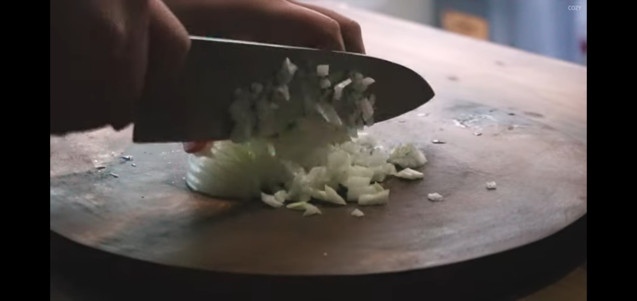 양파 반 개는 잘게 다져주고, 나머지 1/4개는 채썰어 준비해 주세요. 양송이버섯 4개도 깔끔하게 채썰어 두면 됩니다.