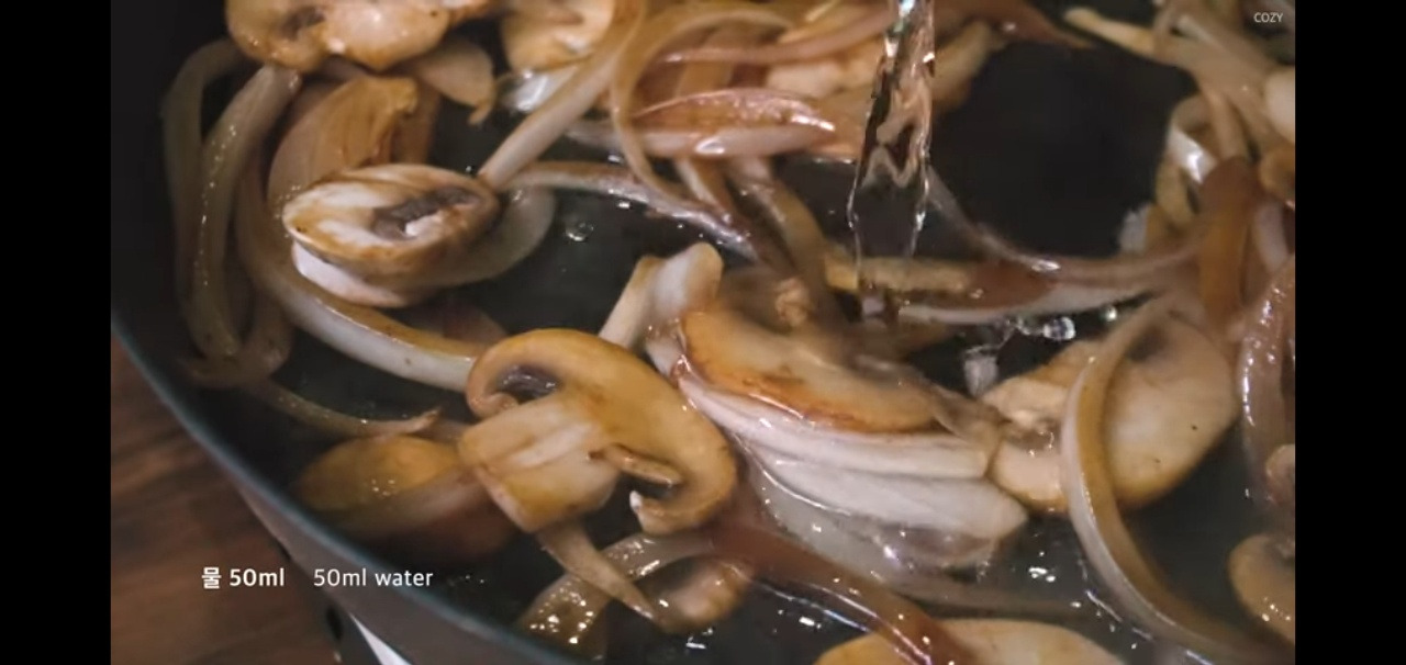 이제 채 썬 양파와 양송이버섯, 물 50ml를 팬에 넣고, 졸이면서 익혀주세요.
