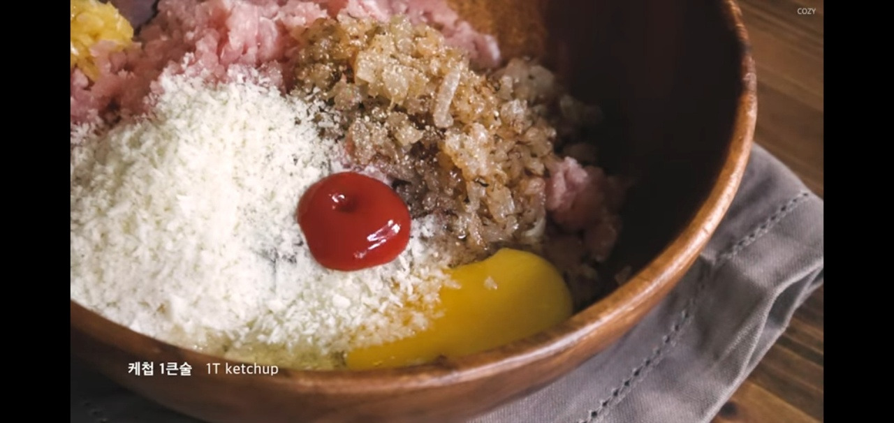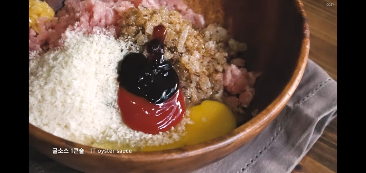 케첩 1스푼과 굴소스 1스푼을 넣어 맛을 더해주면, 함박스테이크의 풍미가 한층 살아난답니다.