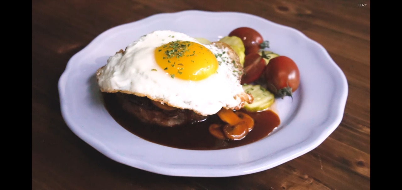 그 후, 소스를 얹고 반숙 계란도 하나 올려주면 오늘의 함박스테이크 완성!