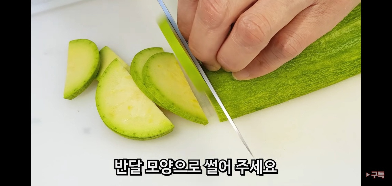 그 다음, 애호박을 반으로 갈라서 반달 모양으로 먹기 좋게 썰어주세요!