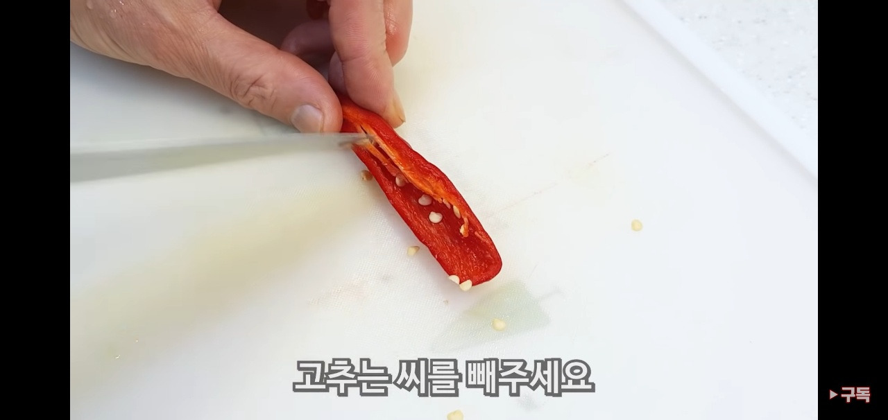 그다음 홍고추는 반으로 갈라서 씨를 빼고, 잘게 썰어주세요.