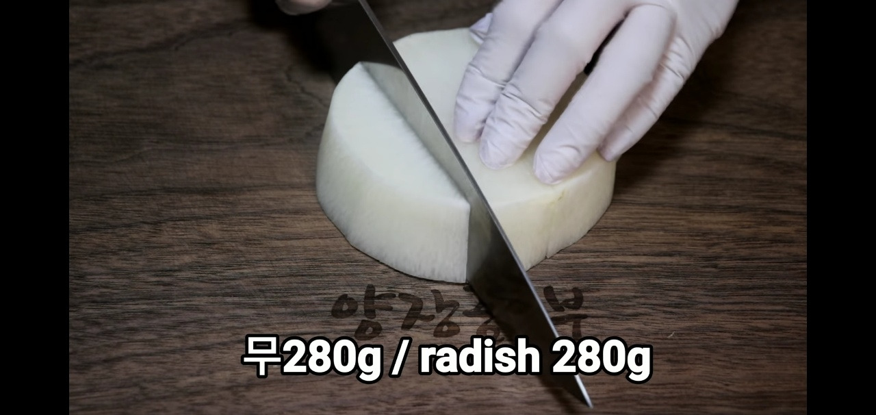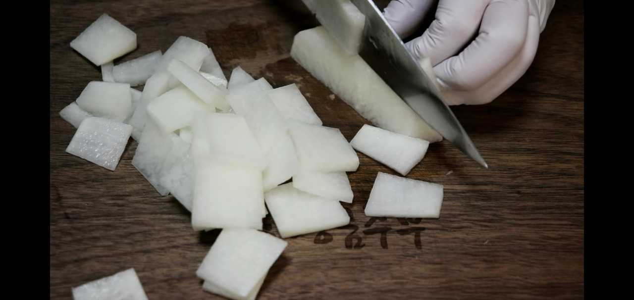 황태국을 끓이기 위한 재료들을 손질해볼게요. 무 280g은 취향에 맞게 적당한 크기로 썰어주시고, 대파 반 대는 깨끗하게 씻은 후 작게 썰어주세요.