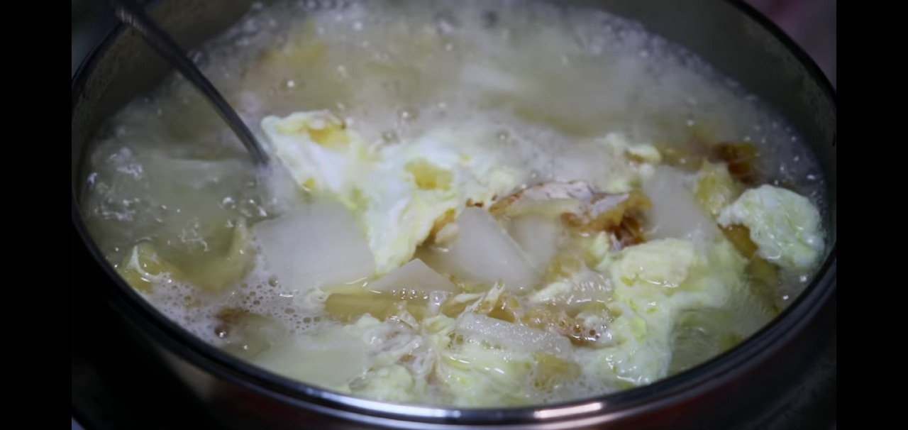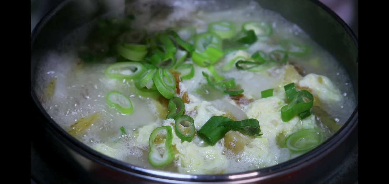 무가 투명해지기 시작하면, 잘 풀어둔 계란 한 개를 넣고 함께 끓여주세요.
