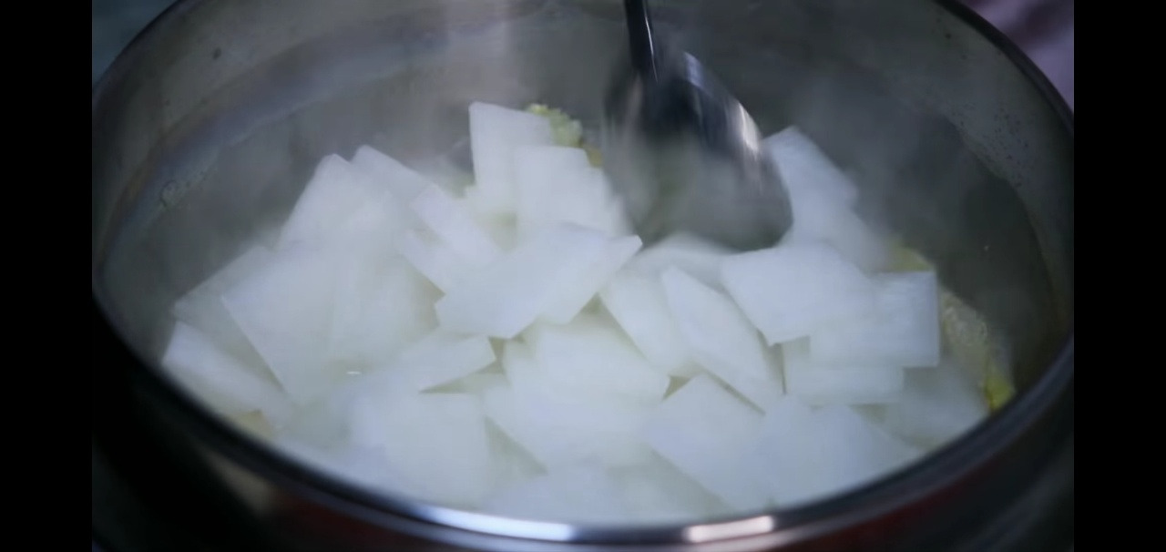 황태를 익힌 후 우러난 육수에 무를 넣어 익혀주세요. 3분 정도 끓인 후, 불을 중불로 낮추고 썰어둔 무와 다진 마늘 반 스푼을 넣어주세요.