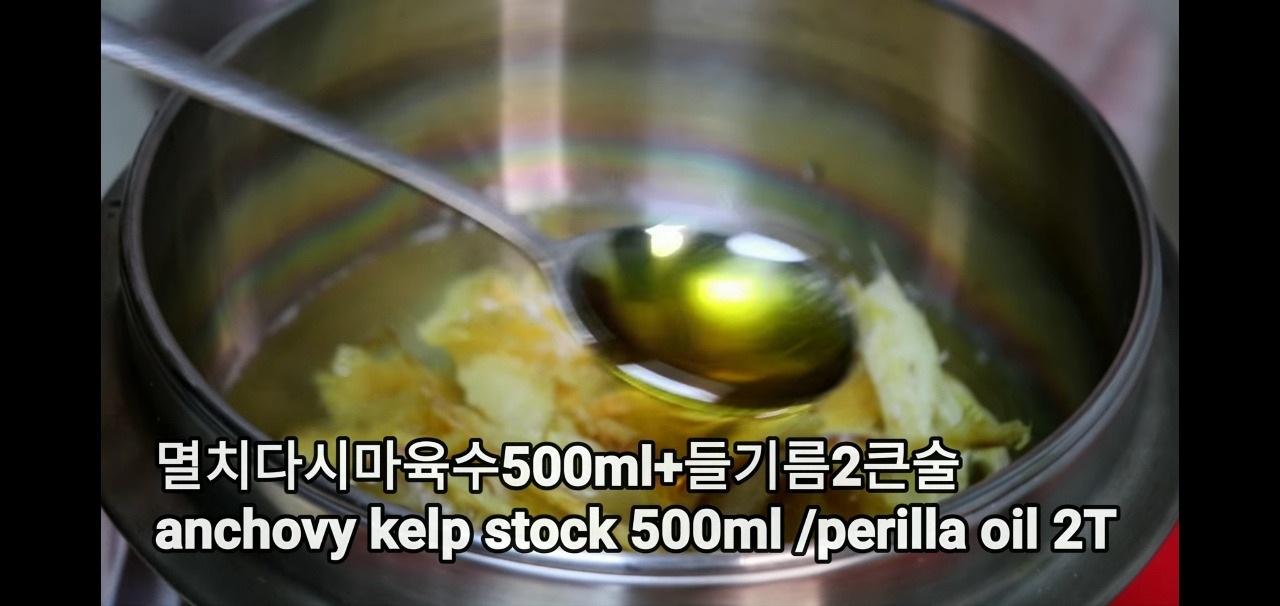 멸치다시마육수 500ml를 넣어 황태국의 깊은 맛을 더해주고, 들기름 2스푼을 둘러주세요.