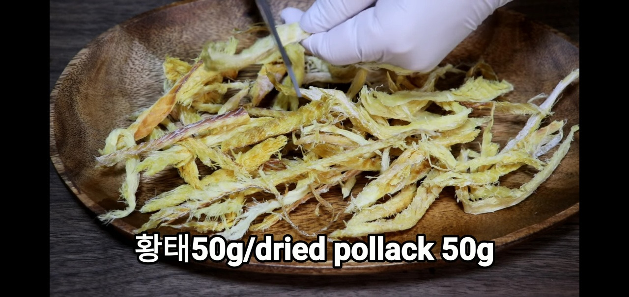 황태 50g의 혹시 있을지 모를 잔가시를 제거하고, 길이가 긴 부분은 먹기 좋은 크기로 잘라주세요.