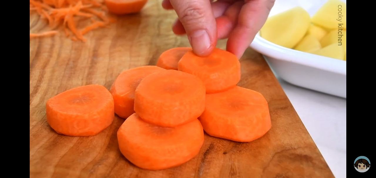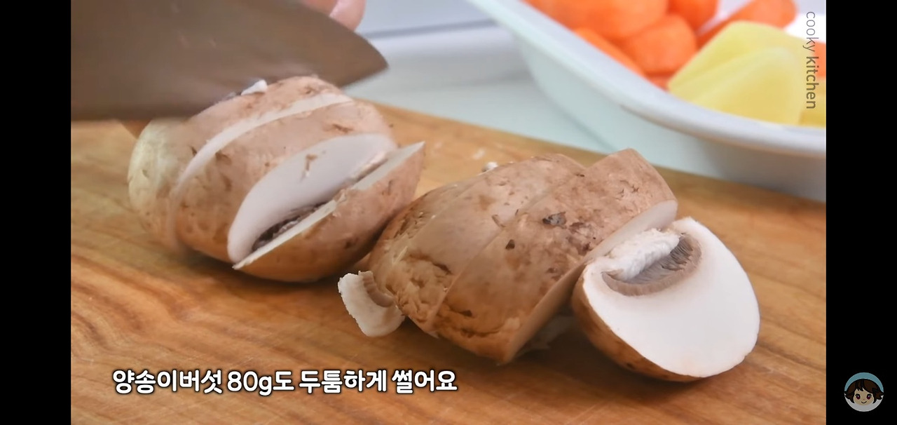 사진처럼 당근의 모서리를 동글동글하게 다듬고, 양송이버섯 80g은 두께감 있게 썰어주세요.