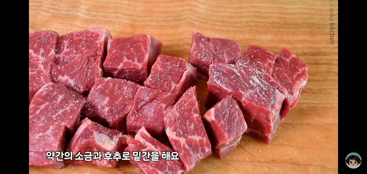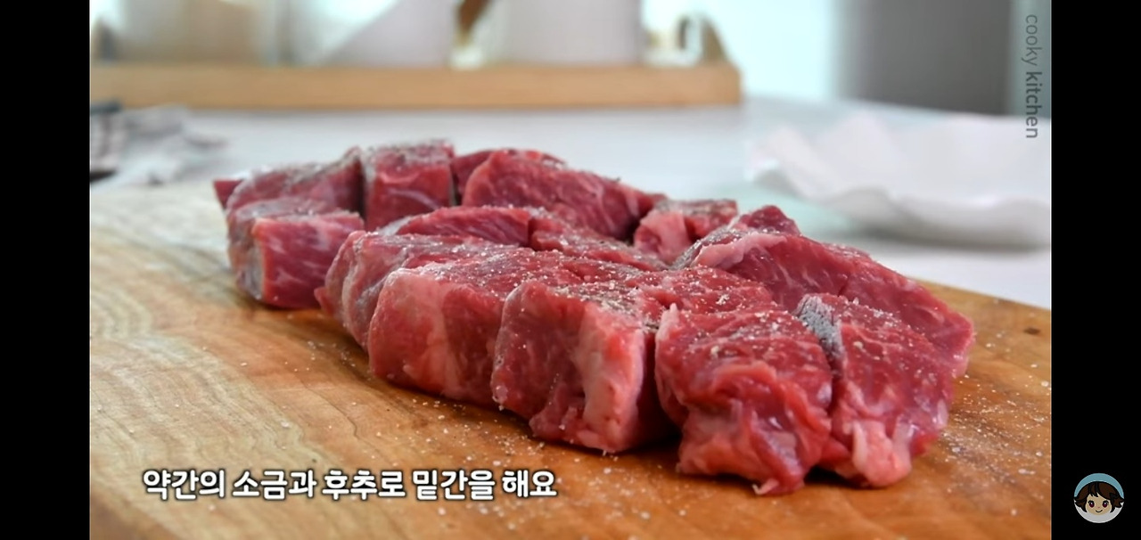 고기를 큼지막하게 썰어준 후, 소금과 후추로 밑간을 하고 잘 섞어주세요.