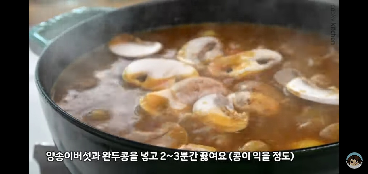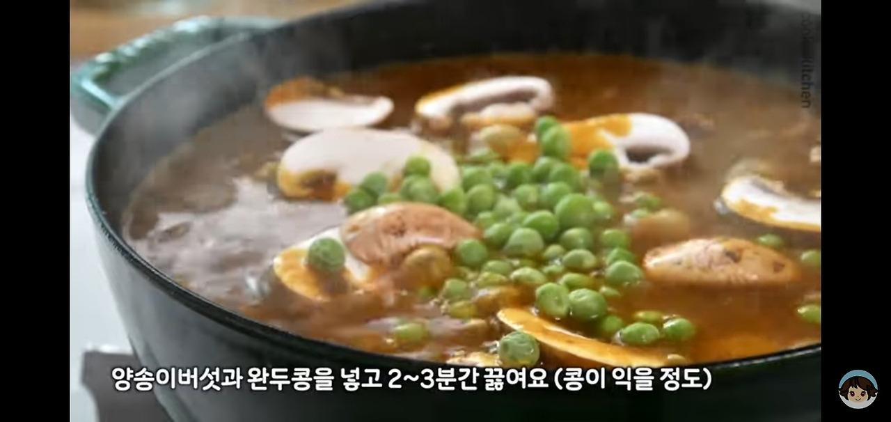카레가 잘 녹아 어우러졌다면, 준비해둔 양송이버섯과 완두콩을 넣어주세요. 콩이 부드럽게 익을 때까지 약 2~3분 정도 더 끓여주시면 됩니다.