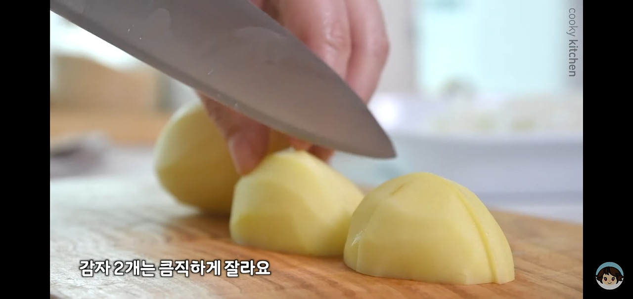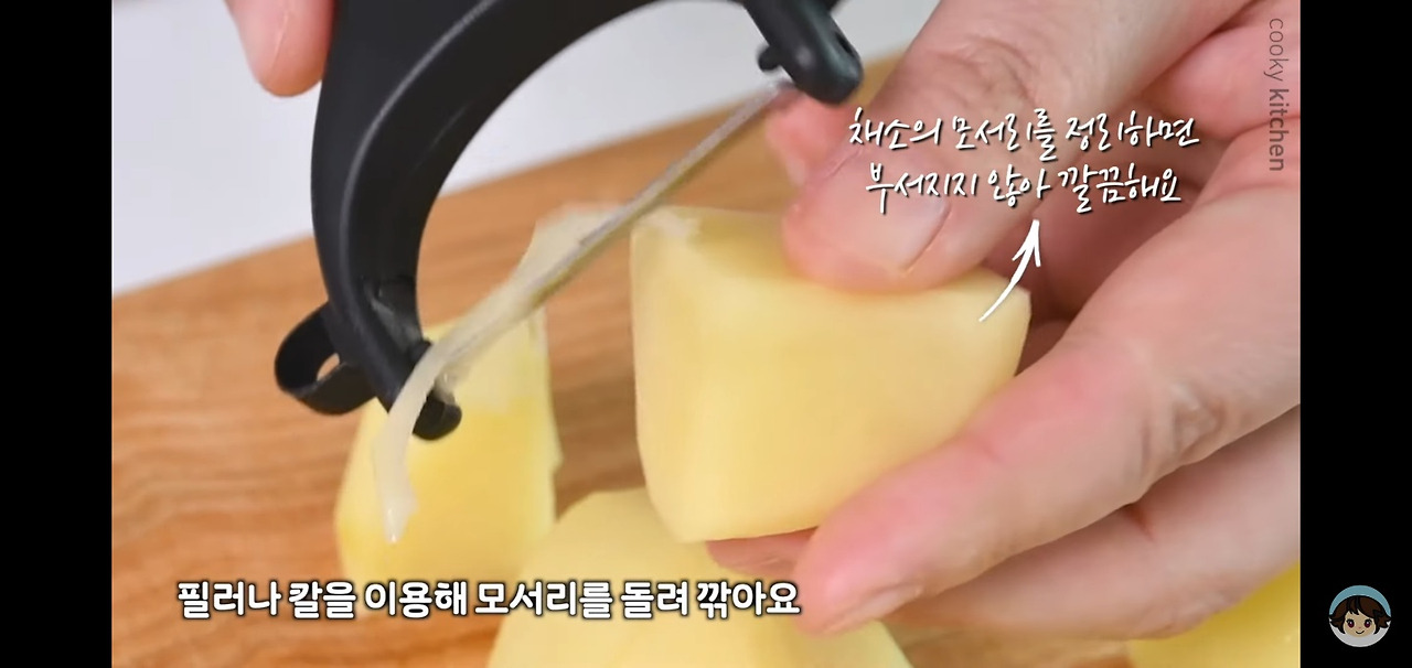 감자는 크고 고르게 자른 후, 모서리 부분을 칼이나 도구를 사용해 다듬어 주세요.