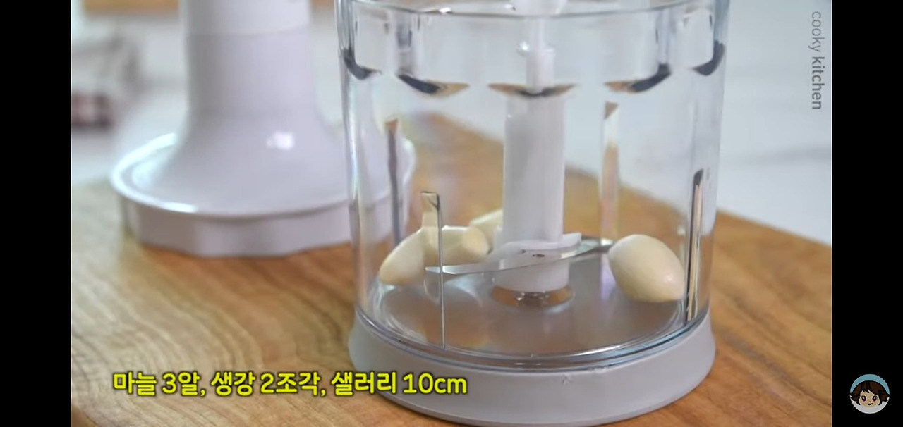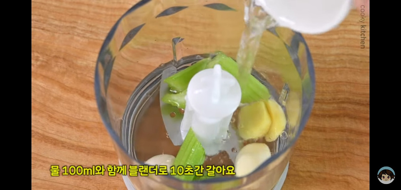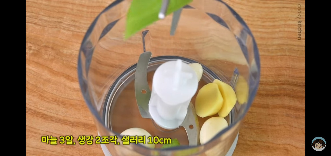 믹서기에 마늘 3쪽, 생강 2조각, 그리고 샐러리 10cm 정도를 넣어주세요.