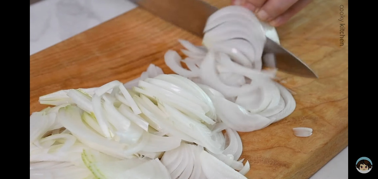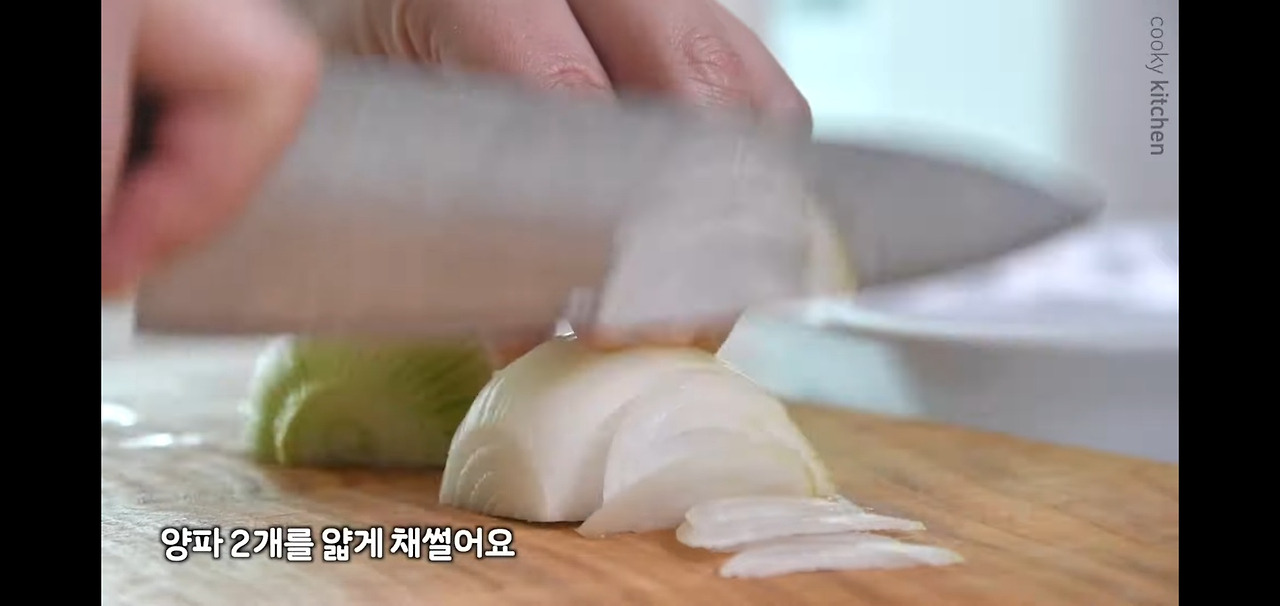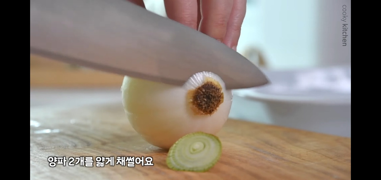그다음에는 양파를 얇게 슬라이스해서 준비해 주세요.