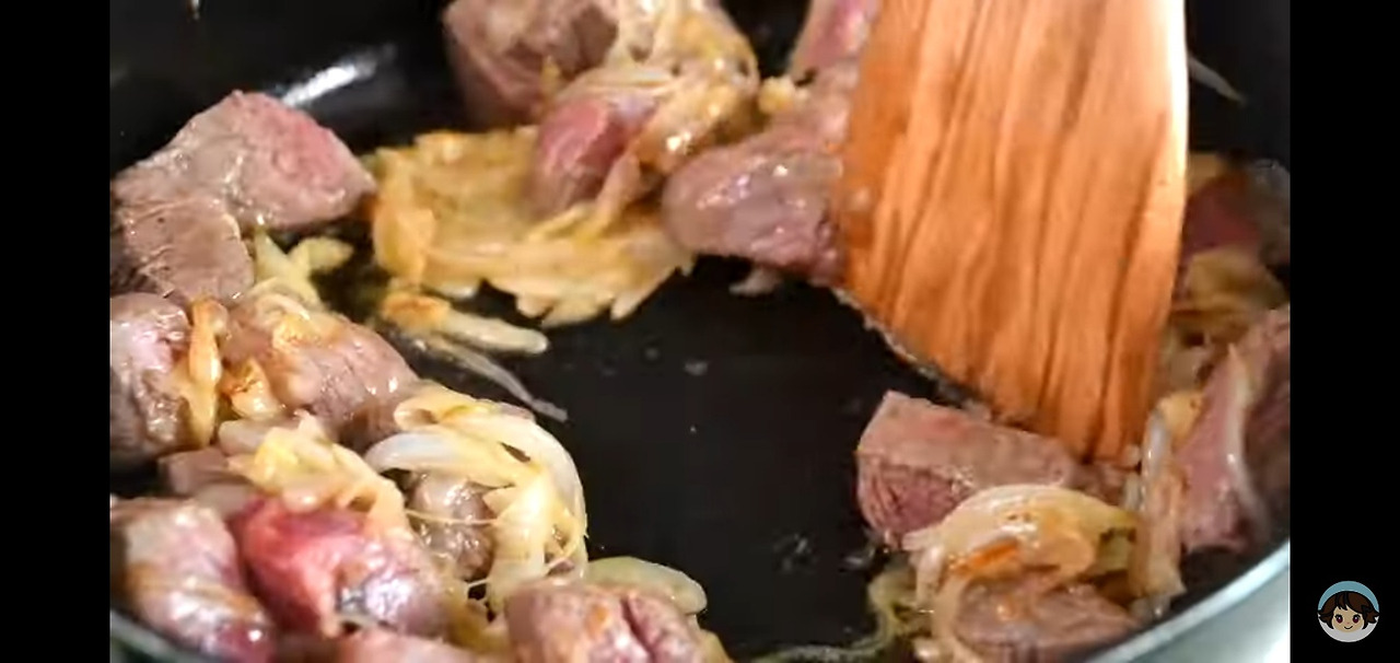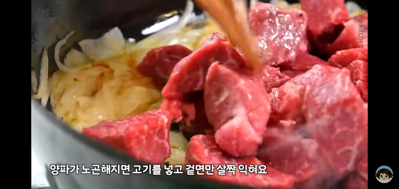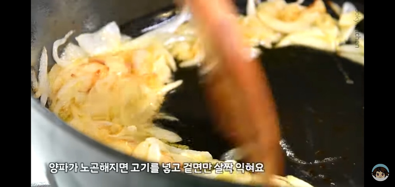 노릇하게 익힌 양파 위에 준비해둔 고기를 올리고, 겉면이 살짝 익을 정도로만 볶아주세요.