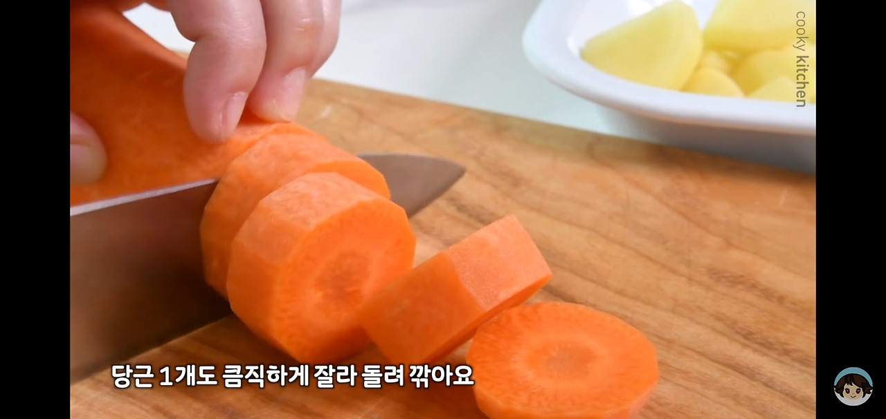 당근도 적당한 크기로 잘라주세요. 푹 익은 부드러운 당근은 카레에 넣으면 씹는 맛이 좋고, 정말 맛있답니다.