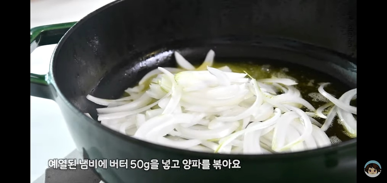 녹인 버터 위에 준비해둔 양파를 넣고 고르게 섞어가며 볶아주세요. 10~15분 정도 천천히 익히면서 양파가 부드럽고 달달해지도록 해주시면 돼요.