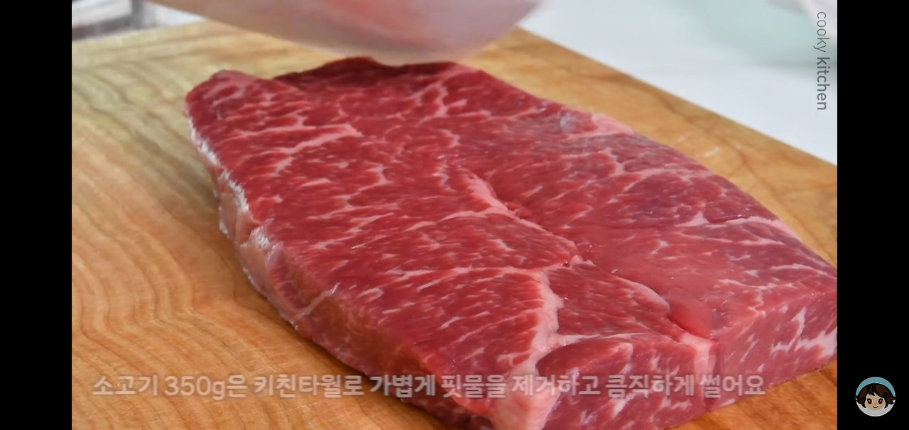이번에 사용할 소고기 350g은 키친타월로 살짝 눌러서 핏물을 제거해 주세요.