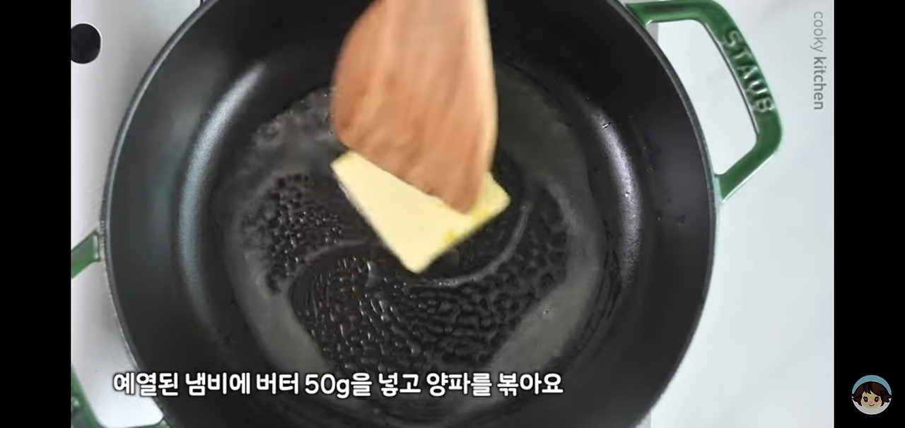 먼저 예열된 냄비에 버터 50g을 넣고, 버터가 잘 녹을 때까지 기다려주세요.
