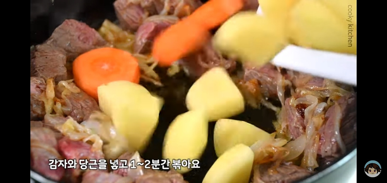 고기의 겉면이 사진처럼 노릇하게 색이 돌기 시작하면, 준비해둔 감자와 당근을 넣고 약 1~2분 정도 가볍게 볶아주세요.