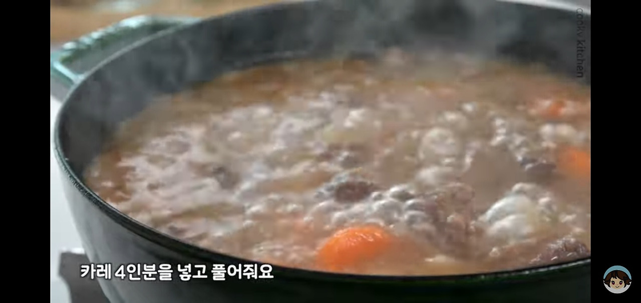 그럼 이제 본격적으로 카레를 완성해볼 차례입니다. 10분 동안 끓인 재료에 고형 카레 4인분 분량을 넣고 골고루 잘 풀어주세요.