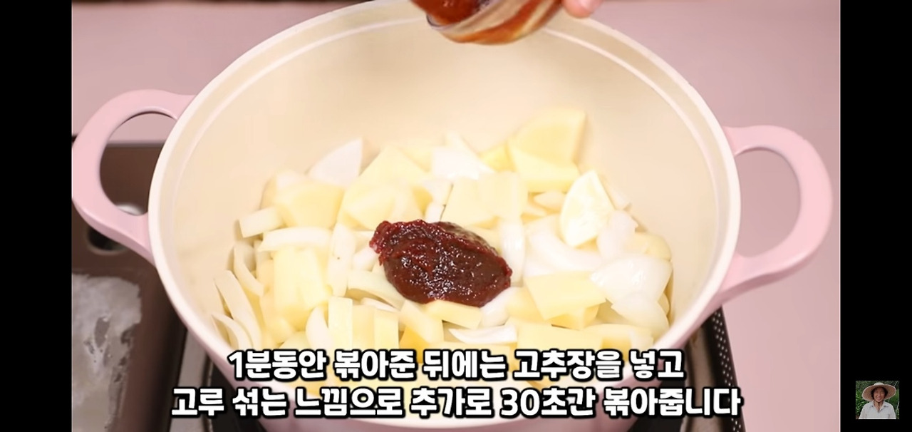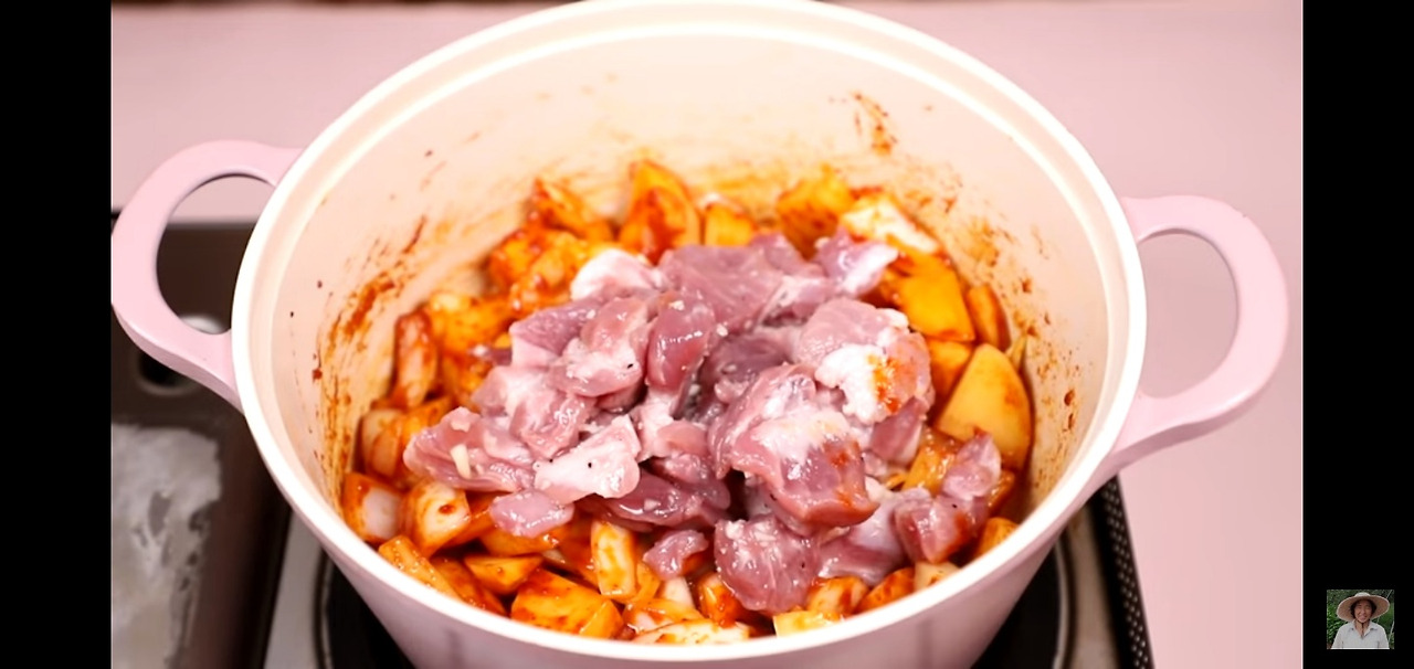 이제 그 위에 고추장과 고기를 넣고 잠시 볶아서 고기에 색깔이 나게 해 주세요.